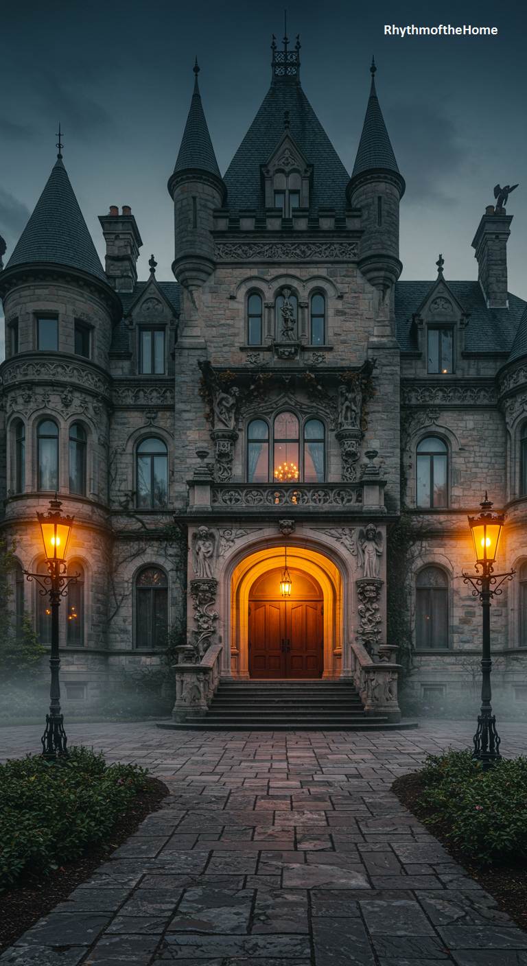 This magnificent stone Victorian home looks more like a castle than a private residence, exuding an aura of gothic fantasy. Its facade is a breathtaking composition of towers, turrets, and crenellations, with ornate stone carvings adorning the grand, arched entryway. On a misty evening, the warm glow from an interior chandelier and two flanking gas lamps creates a dramatic and inviting beacon. This is a home built on a truly epic scale, designed to transport its inhabitants to a world of medieval romance and architectural splendor.