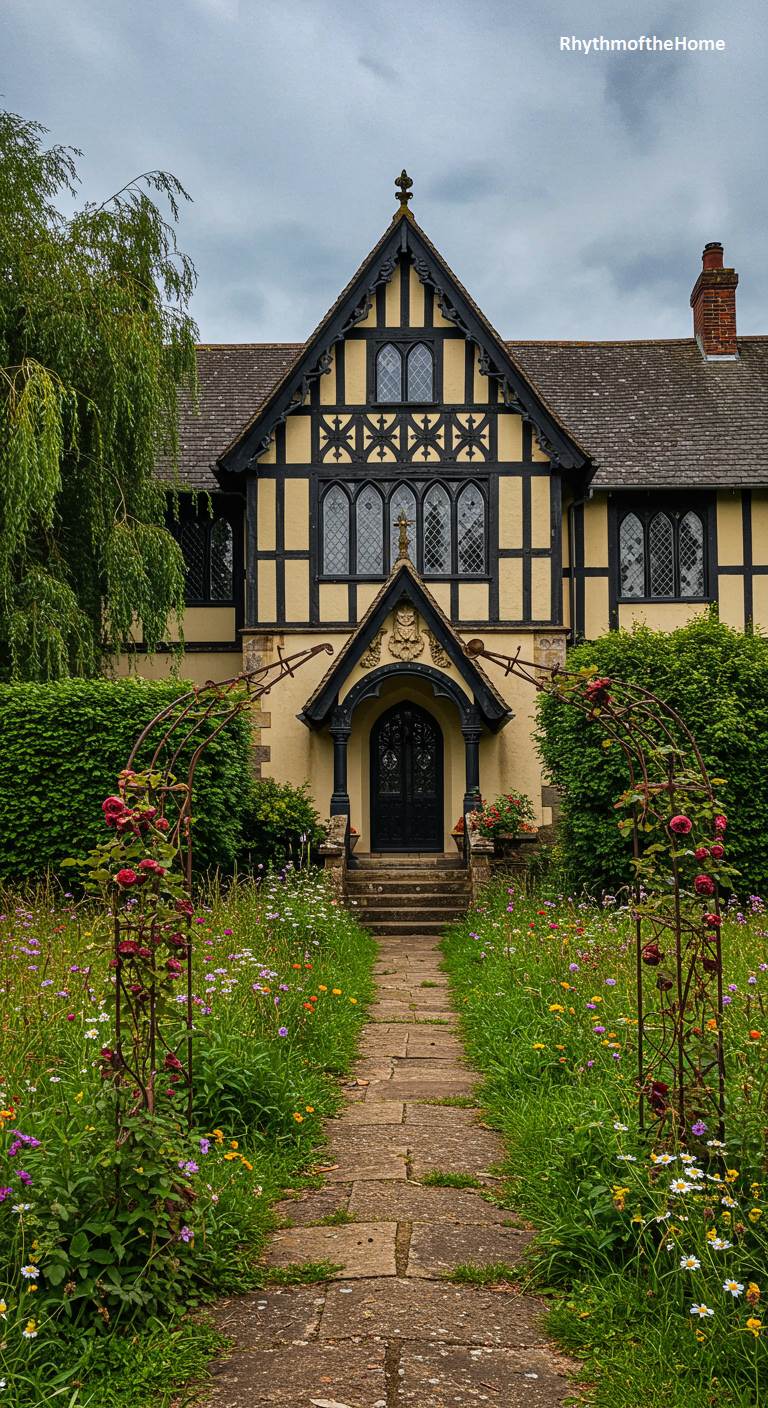 This charming Tudor Revival Victorian home offers a cozy and picturesque vision of English country life. The cream-colored stucco is accented with classic black half-timbering, and the windows feature elegant leaded glass. A stone pathway winds through a delightful cottage garden, bursting with a colorful profusion of wildflowers and framed by two rose-covered arches. The scene is one of rustic tranquility and storybook charm, inviting you to step into a simpler, more beautiful time.