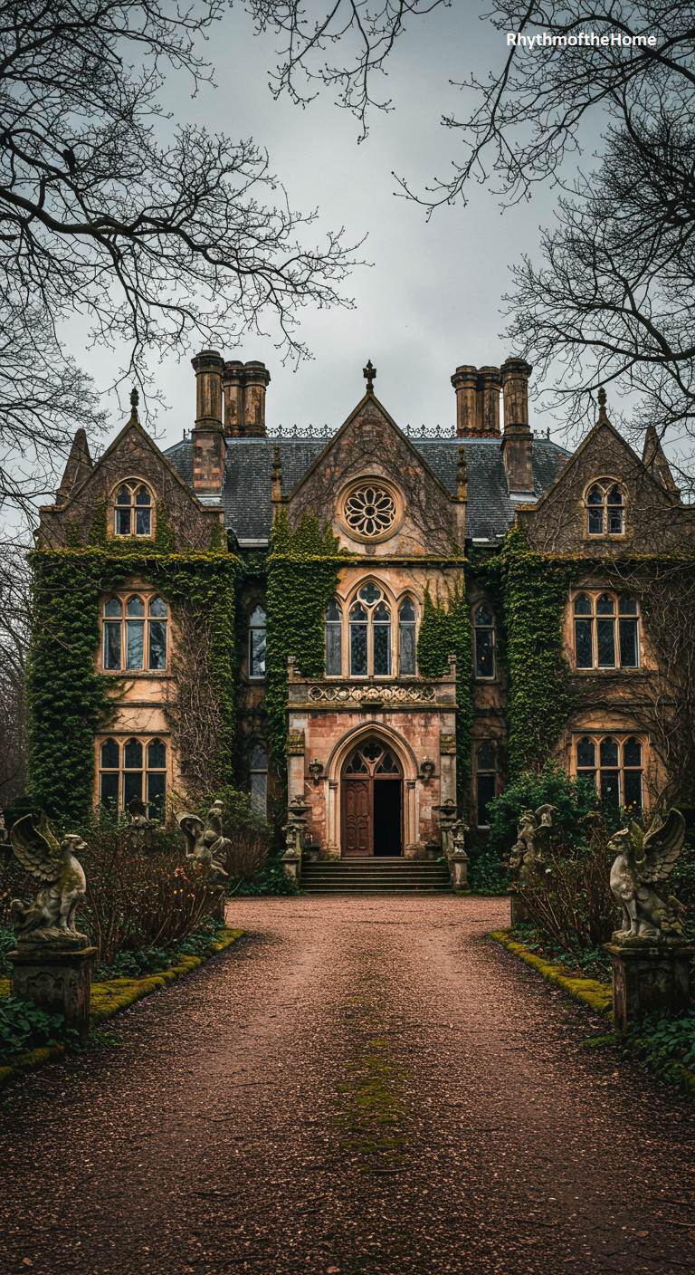 This grand Victorian home possesses the solemn beauty and imposing scale of a Gothic abbey. Its stone facade is almost entirely consumed by thick green ivy, giving it an ancient and mysterious quality. A large rose window sits above the central pointed-arch windows, typical of Gothic Revival architecture. The long gravel drive is lined with weathered stone griffins on pedestals, standing as silent guardians of this historic estate. Under an overcast sky, the home is the epitome of romantic decay and gothic splendor.