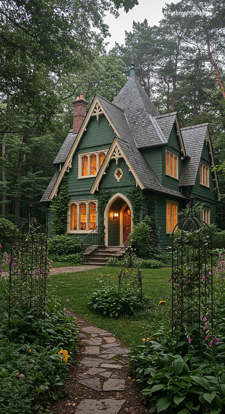 Nestled deep within a lush woodland, this Gothic Revival Victorian home seems to be part of an enchanted forest. Its dark green siding allows it to blend harmoniously with the surrounding foliage, while the cream-colored trim highlights its charming architectural details, such as the pointed arches and quatrefoil window. Warm light glows from the windows, creating a welcoming beacon in the twilight. A flagstone path meanders through a magical cottage garden filled with foxgloves, leading to rustic gates that open into this fairytale scene.