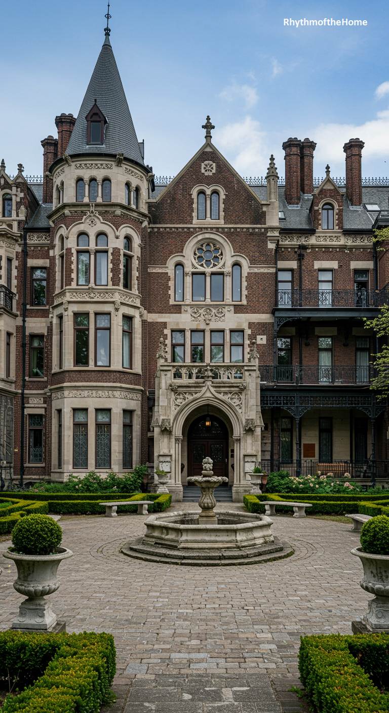 This impressive Victorian home draws its inspiration from the grand chateaux of France. Its stately facade combines rich brown brick with ornate limestone detailing around the windows and a magnificent, carved entryway. An elegant round turret anchors one corner, while multiple tall chimneys punctuate the complex roofline. The home is built around a paved courtyard featuring a central fountain, creating a formal and sophisticated entrance. This is a residence of immense character and European-inspired grandeur, showcasing exquisite craftsmanship and timeless design.