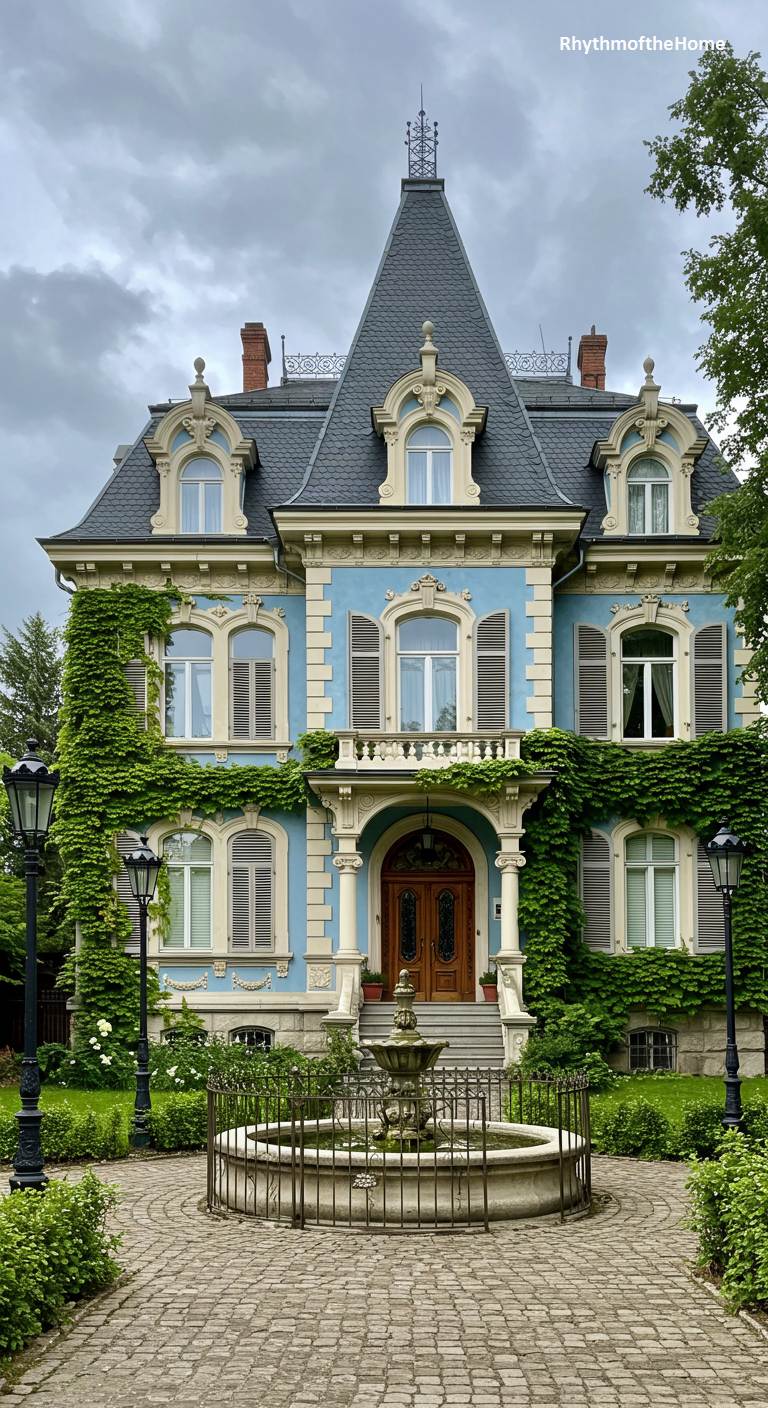 Exuding European elegance, this French Second Empire Victorian home stands with stately grace. Its facade is a sophisticated pale blue, accented with ornate cream-colored window surrounds and a formidable mansard roof of dark slate. Lush green ivy climbs the walls, adding a touch of romanticism to the formal architecture. In the foreground, a classic tiered fountain sits at the center of a cobblestone courtyard, creating a grand and welcoming entrance. This property feels like a slice of Parisian splendor, meticulously maintained and overflowing with timeless charm.