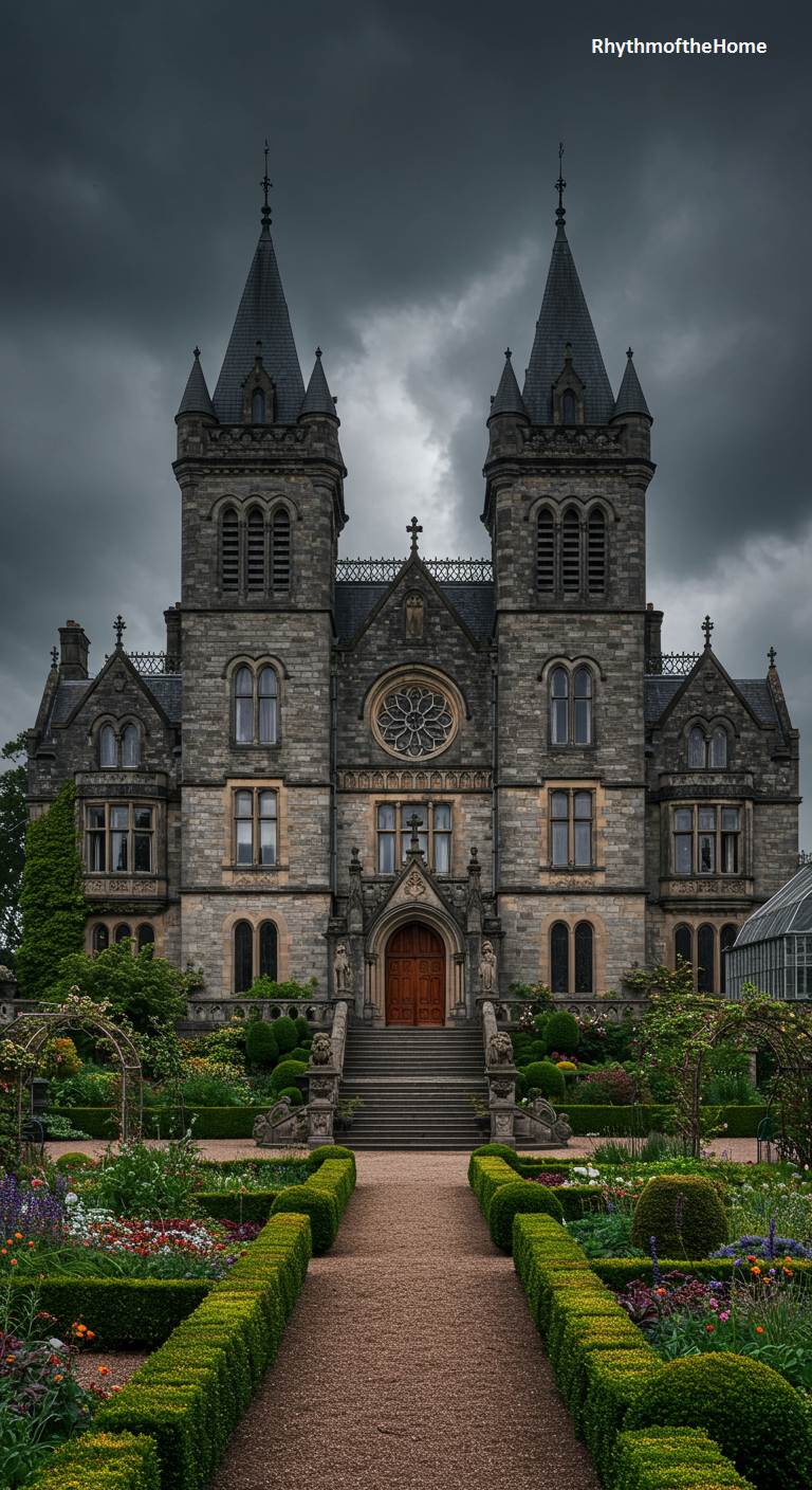 This formidable Victorian home is a stunning example of Gothic Revival architecture, dominated by two imposing, symmetrical towers. Its stone facade, central rose window, and pointed arches give it the magnificent air of a cathedral or a prestigious university building. A long, straight path flanked by formal boxwood hedges leads the eye directly to the grand staircase and entrance. Under a dramatic, stormy sky, the house is a breathtaking display of architectural ambition and dark, romantic beauty.