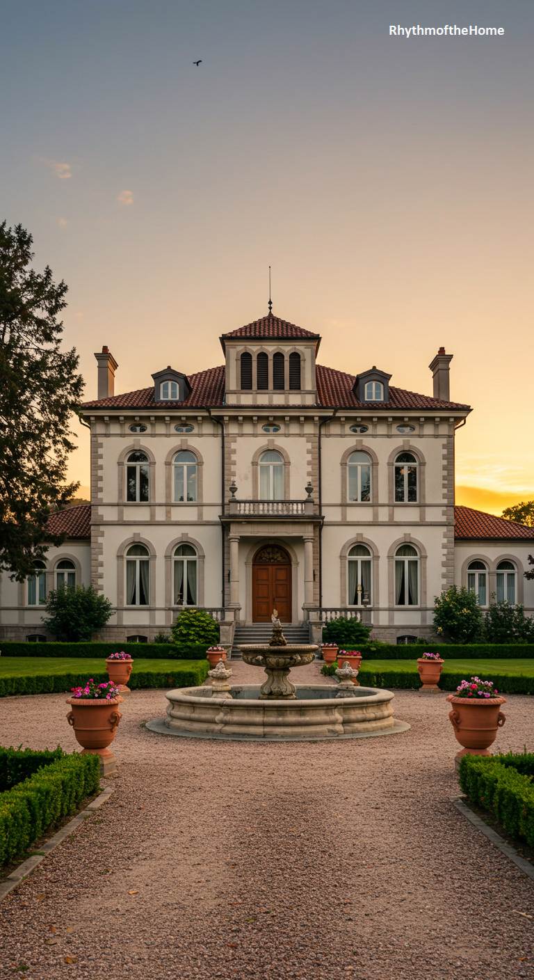 Bathed in the warm, golden glow of a setting sun, this beautiful villa exudes a sense of peace and Mediterranean elegance. Its classic Italianate design features a symmetrical facade, soft white stucco, and a red tile roof. A central fountain in the gravel courtyard serves as a graceful focal point, with neatly trimmed box hedges defining the formal garden spaces. This home feels like a luxurious retreat on the Italian coast, offering a perfect blend of stately architecture and serene natural beauty.