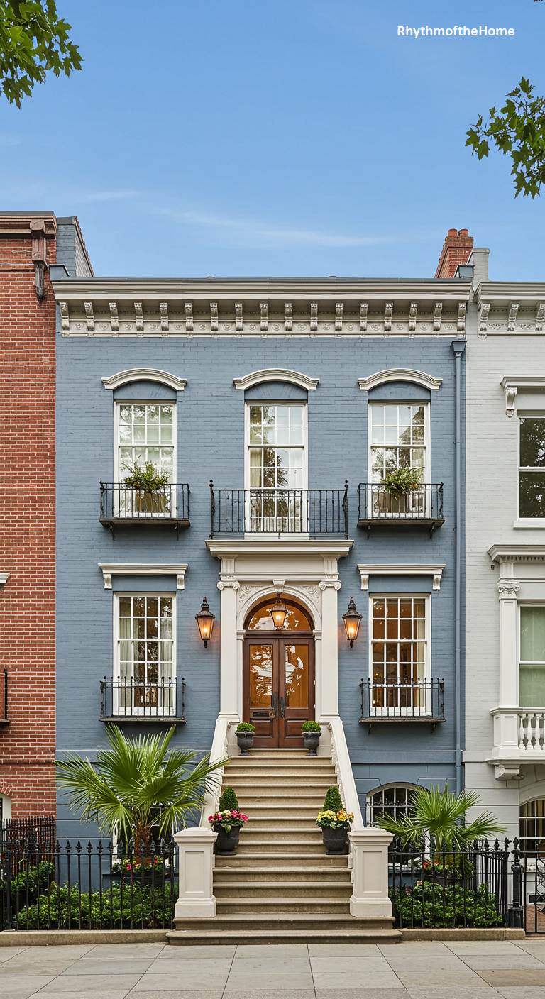 This sophisticated townhouse is a perfect example of refined urban living. Its facade is painted a chic blue-gray, with crisp white trim highlighting the elegant windows. A grand staircase provides a stately approach to the rich, wood-toned front doors. Delicate wrought-iron railings and window boxes add a touch of Parisian flair. This home seamlessly blends historic architectural grace with a modern sense of style, creating a timeless and highly desirable city residence.