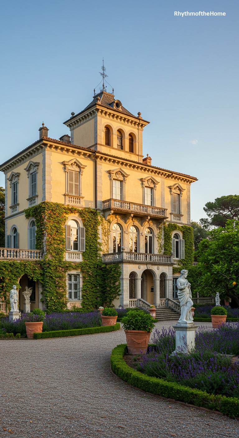 This stunning Italianate villa is a romantic dream, bathed in the warm light of a late afternoon sun. Its yellow stucco walls are draped with climbing vines, and a prominent tower rises above the main structure. The grounds are a fragrant oasis, with a winding gravel path leading past classical statues and through lush beds of purple lavender. Terracotta pots filled with greenery are placed throughout, enhancing the authentic Mediterranean feel. This is a place of serene beauty and luxurious, sun-drenched living.