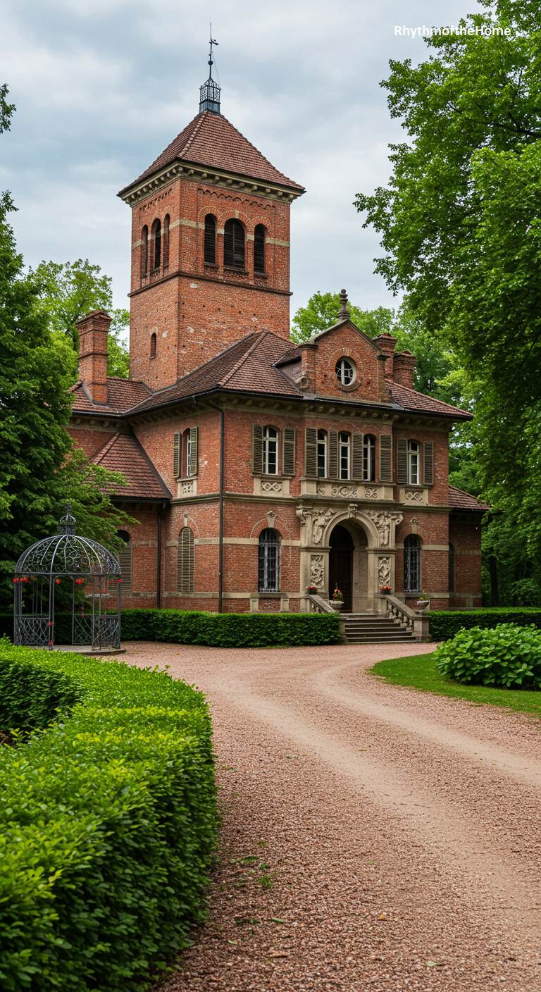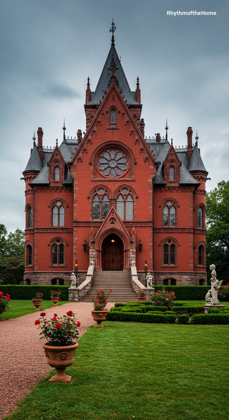 This magnificent Victorian residence is a masterpiece of High Gothic Revival architecture, so grand and ornate that it resembles a small cathedral. Built from rich red brick, its facade features a stunning central rose window, intricate pointed-arch windows, and numerous spires and finials that reach for the sky. The formal grounds, with their classical statues and terracotta pots filled with red roses, add to the sense of imposing, almost sacred, grandeur. This is a true architectural treasure, a testament to the ambition and craftsmanship of the Victorian era.