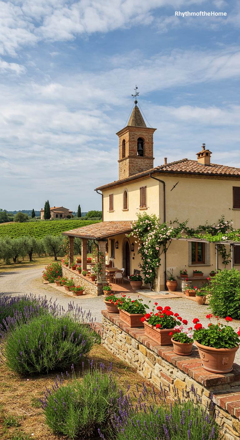 This charming property captures the idyllic essence of a Tuscan farmhouse. The warm, sun-baked stucco exterior, terracotta tile roof, and simple bell tower create an authentic, rustic feel. A covered porch offers a shady spot for outdoor dining, while climbing roses and potted geraniums add vibrant splashes of color. The home is set amidst rolling hills that appear to be vineyards, with rows of lavender in the foreground completing the picturesque scene. This is a peaceful, rustic retreat that embodies the relaxed beauty of the Italian countryside.