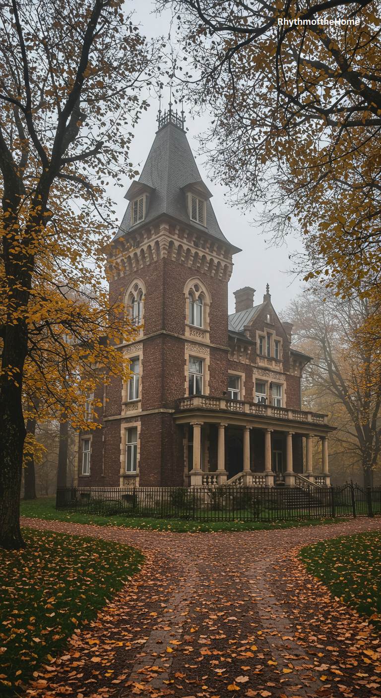 This stately Second Empire Victorian home is imbued with a moody, autumnal atmosphere. Its brick facade and prominent tower with a mansard roof are classic features of the style. Set against a backdrop of trees with golden leaves and a foggy sky, the scene is melancholic and beautiful. A leaf-strewn circular driveway forks in front of the grand porch, as if awaiting the arrival of a horse-drawn carriage. This home evokes a sense of gothic romance and the poignant beauty of the changing seasons.