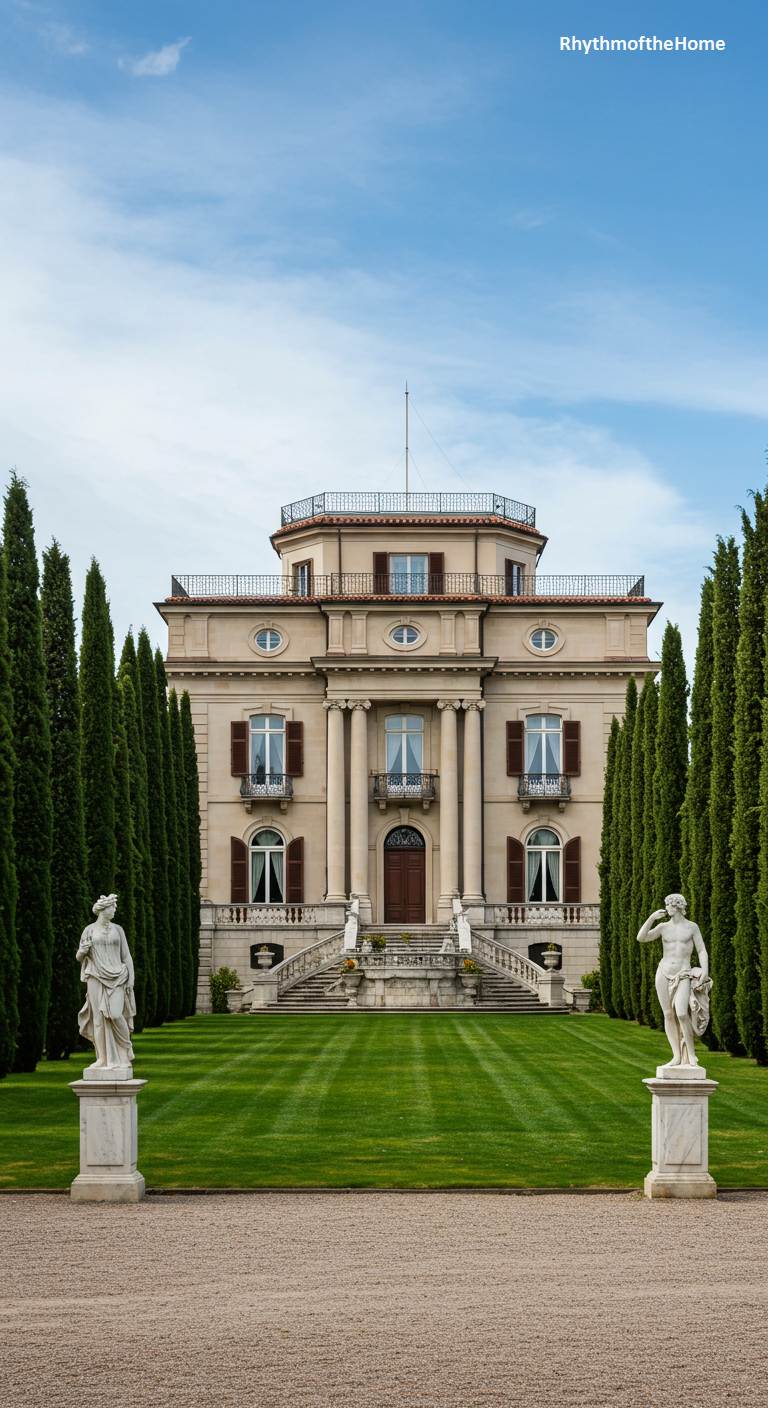 This grand villa is a stunning example of Neoclassical and Italianate influences, designed with perfect symmetry and classical proportions. A central portico with columns supports a second-floor balcony, and the entire structure is crowned with an elegant octagonal belvedere. The villa is framed by two rows of tall, slender cypress trees, which guide the eye towards the entrance and enhance its formal, stately presence. Two classical statues stand guard, completing this picture of immense wealth, order, and timeless architectural beauty.