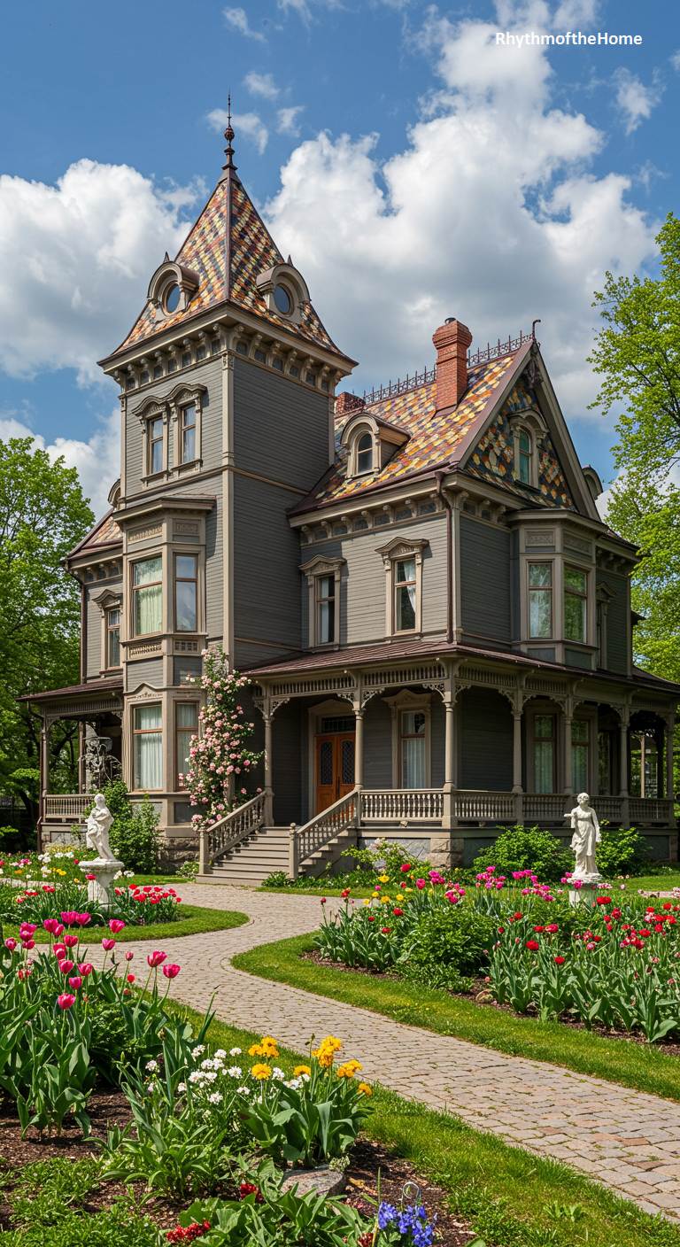This spectacular Queen Anne Victorian home is a springtime vision, distinguished by its incredibly vibrant, patterned roof made of colorful slate tiles. The main body of the house is painted a subtle grey, allowing the magnificent roof to be the star of the show. A winding path meanders through a breathtaking garden overflowing with tulips in every imaginable color—pink, red, yellow, and purple. This home is a joyful and artistic celebration of color and craftsmanship, from its ornate roof to its stunning floral display.