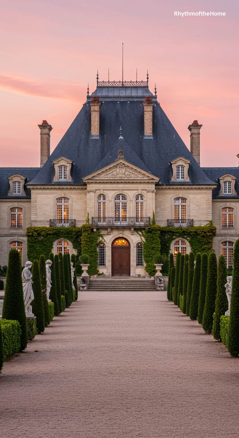 This breathtaking residence is the epitome of French chateau-style grandeur, a luxurious estate seemingly transported from the Loire Valley. Its limestone facade, steep mansard roof, and symmetrical design are all hallmarks of classic French architecture. The approach is nothing short of majestic: a long, straight gravel path lined with perfectly manicured conical trees and classical statues, creating a formal allée that leads to the grand entrance. As a soft pink sunset colors the sky, the home glows with an aura of opulence and romantic splendor.
