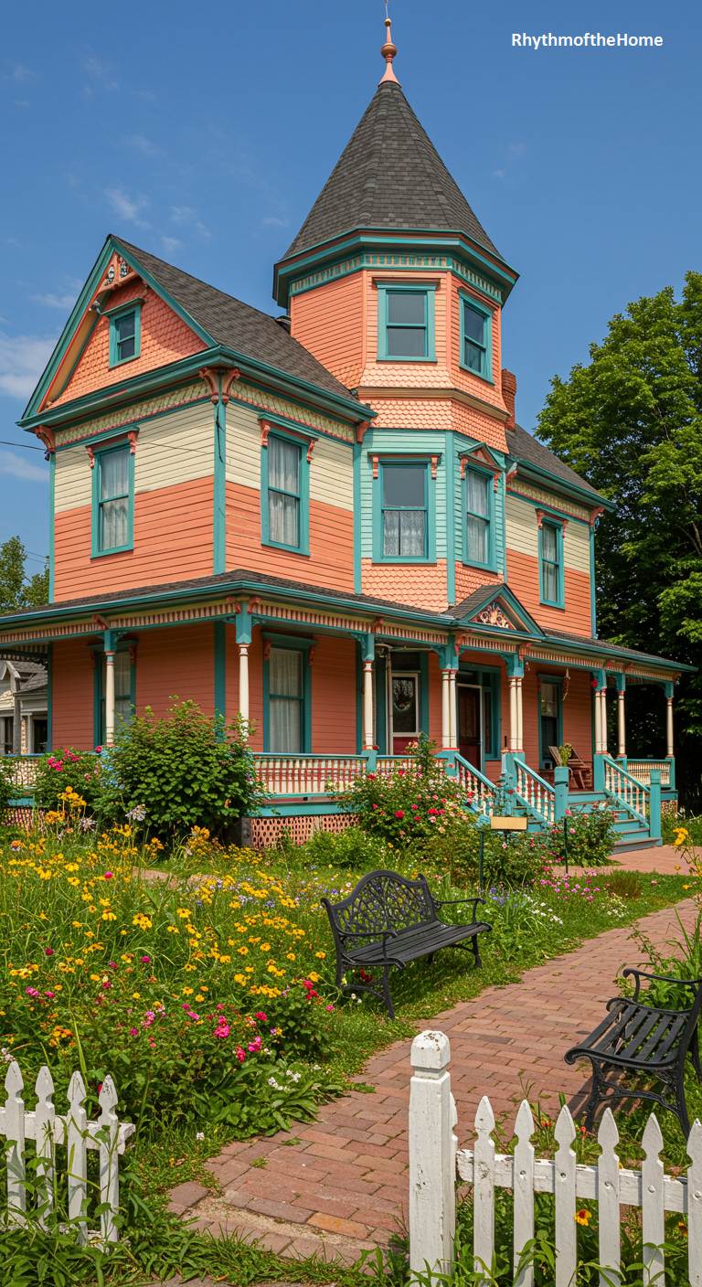 This cheerful Queen Anne Victorian home is a vibrant “Painted Lady,” bursting with life and color. Its salmon pink and cream siding, accented with bright turquoise trim, creates a joyful and welcoming facade. The property is surrounded by an exuberant cottage garden, a riot of black-eyed Susans, zinnias, and other wildflowers. A simple brick path winds past wrought-iron benches and a quaint white picket fence. This is a home that radiates happiness, creativity, and a deep love for the untamed beauty of a summer garden.