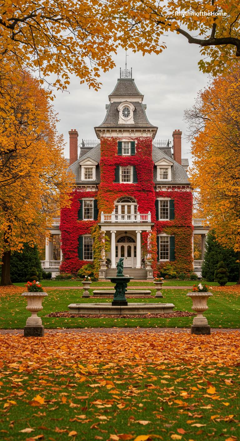 This magnificent Second Empire Victorian home is spectacularly draped in a cloak of brilliant red autumn ivy. The fiery foliage creates a breathtaking contrast with the home’s crisp white trim, columns, and mansard roof. Set on a sprawling lawn covered with a carpet of fallen golden leaves, the scene is a stunning celebration of the fall season. A central fountain and classical statue add to the formal, estate-like feel. This is a house that transforms with the seasons, presenting its most dramatic and beautiful face in autumn.