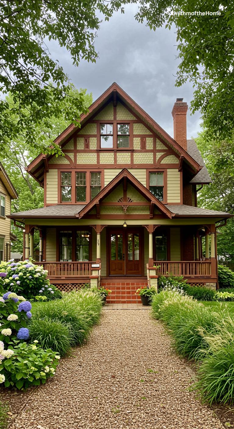 This charming home showcases the earthy tones and sturdy craftsmanship of the Arts and Crafts movement within a Victorian framework. The facade is painted in a harmonious palette of sage green and reddish-brown, with decorative stickwork in the gables adding visual interest. A wide, welcoming front porch with substantial columns provides a perfect spot for relaxation. The surrounding garden is a lush oasis of hydrangeas and ornamental grasses, with a gravel path leading to the inviting double front doors. This house feels deeply connected to its natural surroundings, exuding a sense of calm and understated elegance.