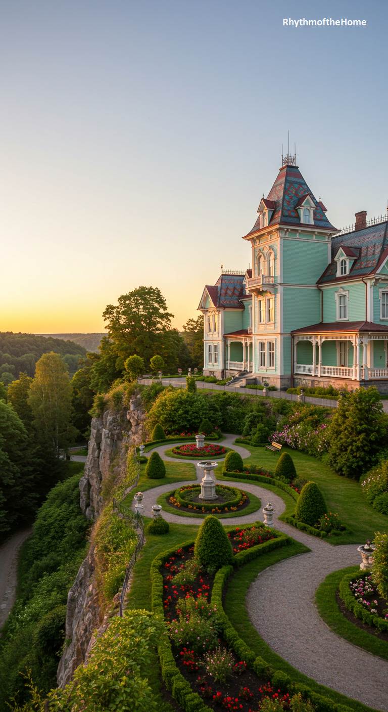 Perched majestically on a dramatic cliff edge, this exquisite Victorian home seems to float above the world. Painted a lovely mint green, it features multiple levels of porches and balconies from which to admire the breathtaking sunset view over the forested valley below. The grounds are a masterpiece of landscape architecture, with intricate formal gardens, geometric flowerbeds, and classical fountains carved right into the precipice. This is a residence of unparalleled romance and beauty, a luxurious sanctuary in a truly spectacular setting.