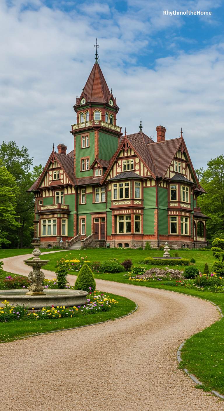 This ornate Victorian home is heavily influenced by the romantic style of a Swiss chalet or German hunting lodge. Its facade is a lively combination of green siding, cream stucco, and dark half-timbering, with numerous balconies and gables creating a complex and picturesque silhouette. A prominent tower with a distinctive roofline adds to its fairytale quality. A curving gravel driveway sweeps through a beautifully landscaped garden, complete with a fountain, leading to this unique and whimsical European-inspired estate.