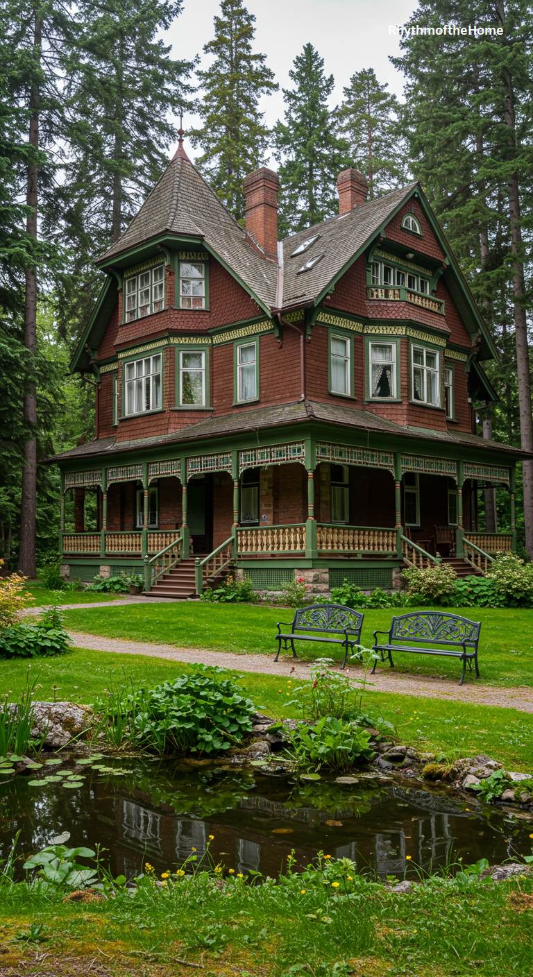 Nestled in a peaceful pine forest, this Stick-Eastlake Victorian home is a masterpiece of rustic elegance. The deep reddish-brown shingle siding is intricately detailed with dark green decorative trim and delicate spindlework on the wraparound porch, showcasing the fine craftsmanship of the era. In the foreground, a small, still pond reflects the trees and sky, adding to the tranquil atmosphere. This is a sophisticated woodland retreat, where ornate architectural detail meets the serene beauty of nature.