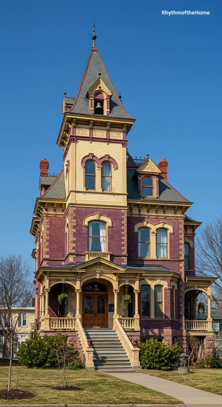 This grand High Victorian Italianate home stands with majestic and imposing dignity. Its facade is a unique purplish-hued brick, elegantly contrasted with cream-colored stone trim and elaborate window hoods. The most commanding feature is the tall, four-story tower, complete with a bell in its belfry, which gives the residence an almost civic or institutional importance. Perched on a slight rise with a grand staircase, this is a home that was clearly built to make a powerful statement of wealth and prominence.
