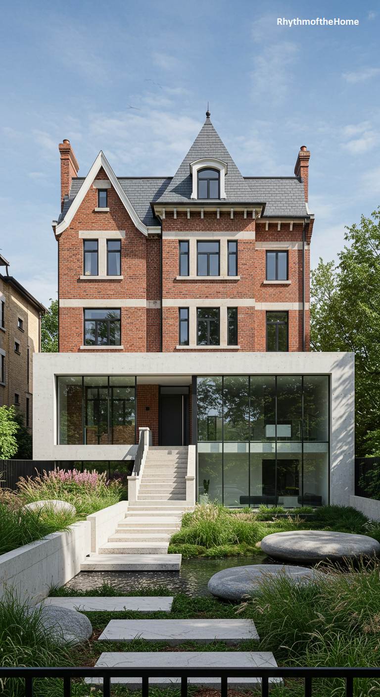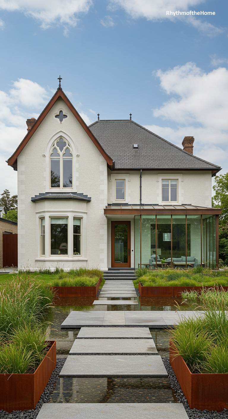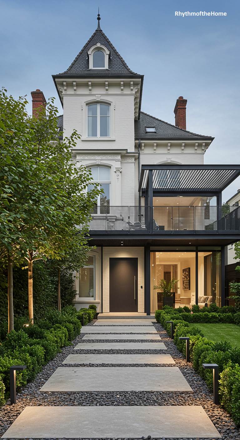 This elegant white Victorian townhouse has been tastefully updated for a chic, modern lifestyle. While the front facade remains classic, the rear has been transformed to embrace indoor-outdoor living. A sleek, black-framed glass extension creates a light-filled sunroom, which opens onto a terrace covered by a modern pergola. The landscaping is minimalist and sophisticated, with a path of separated concrete pavers leading through a manicured lawn and neat box hedges. It’s a perfect blend of historic elegance and contemporary comfort.