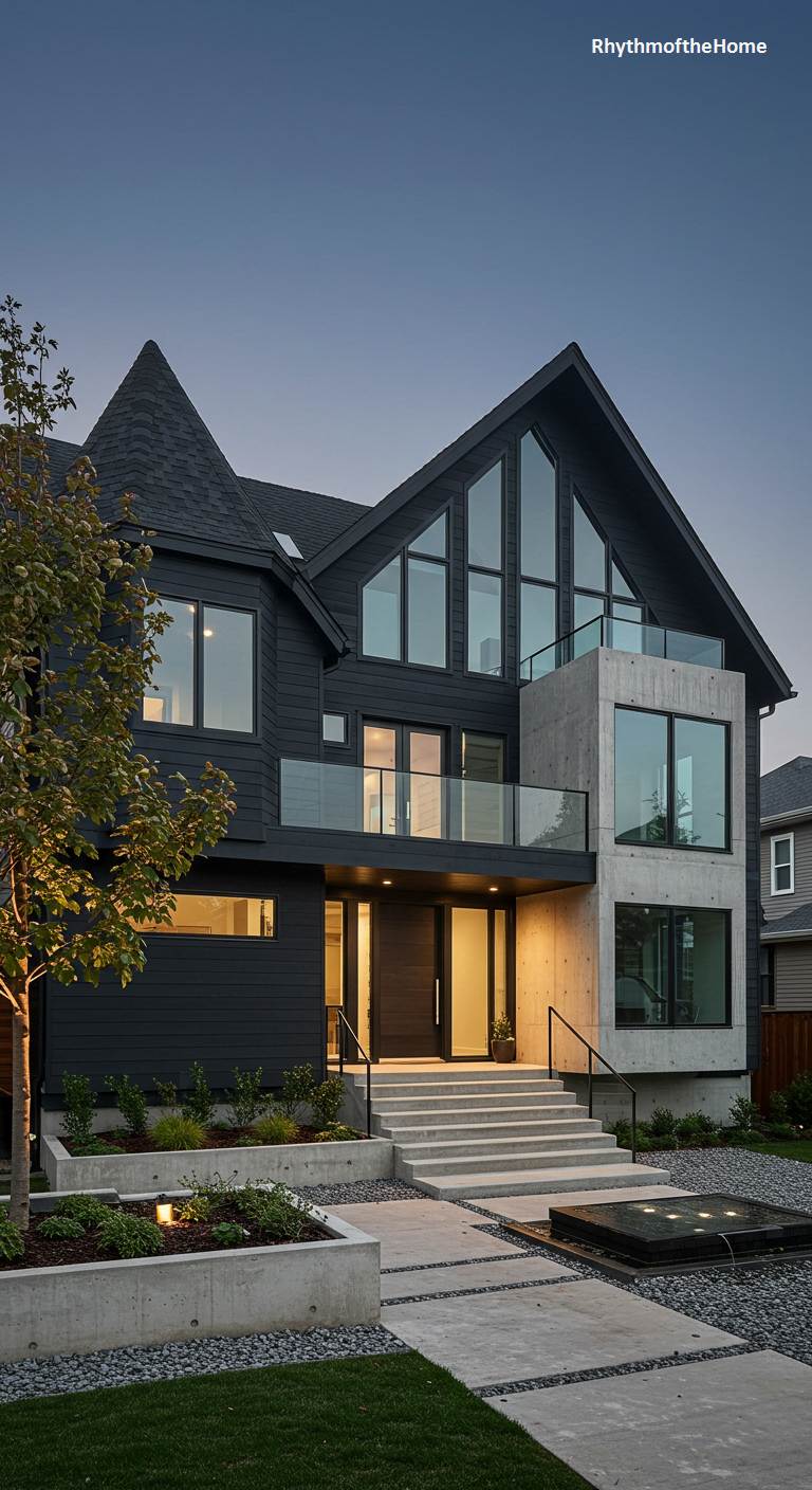 This dramatic black house is a contemporary masterpiece that draws inspiration from Victorian Gothic forms. Its complex roofline features a sharp, A-frame gable and a small, modern turret. A striking tower element made of raw concrete adds an industrial and brutalist touch to the sleek, black-clad facade. Large expanses of glass and a balcony with a clear railing ensure the interior is light-filled, despite the dark exterior. This is a bold, high-design home that combines historical silhouettes with a fearless modern sensibility.