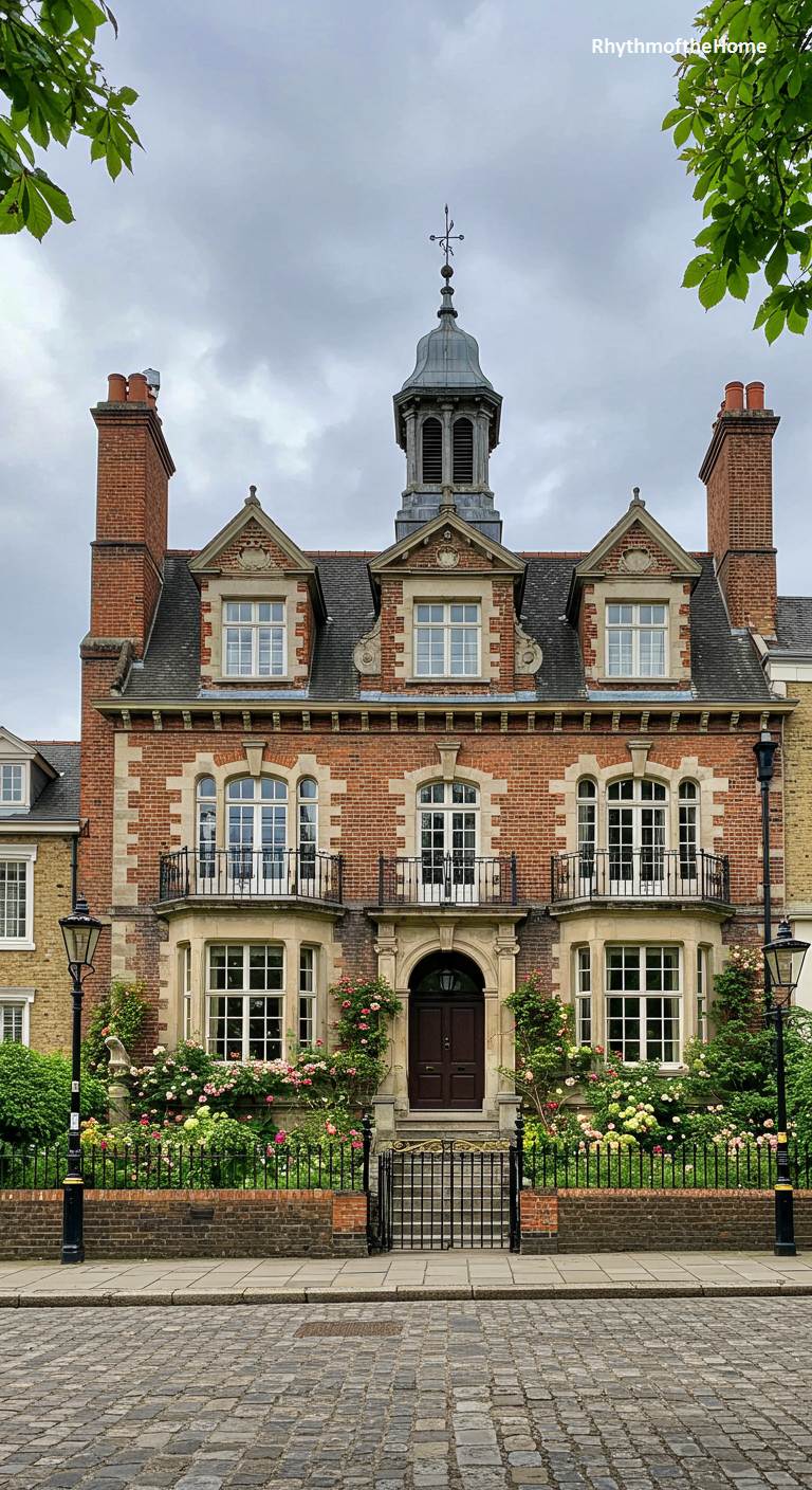 This distinguished brick townhouse exhibits a blend of Queen Anne and Georgian influences, creating a sense of urban grandeur. The rich red brickwork is accented with stone lintels and sills, while a central cupola with a weathervane adds a touch of architectural flourish. Wrought-iron balconies on the second floor and a matching fence enclosing a garden of blooming roses lend an air of classic European elegance. Positioned on a cobblestone street, this home speaks of history, sophistication, and a refined city lifestyle, standing as a proud testament to enduring craftsmanship.