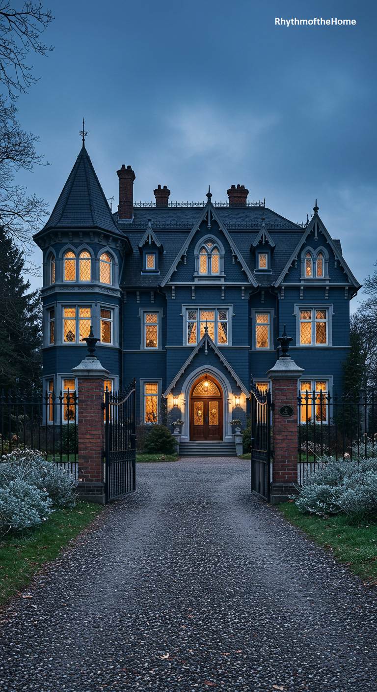 As night falls, this large and stately Gothic Revival Victorian home becomes a beacon of warmth and elegance. Its deep slate-blue siding provides a sophisticated backdrop for the dozens of windows, all glowing with a welcoming golden light. The intricate details of the gables and the grand, arched entryway are softly illuminated, highlighting the home’s fine craftsmanship. The open gates and gravel driveway seem to invite you into its world of timeless grace and classic beauty, a truly magnificent sight in the twilight.