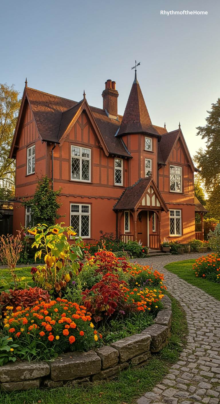 This charming Tudor-style Victorian home radiates warmth and welcome, thanks to its beautiful terracotta-colored stucco and half-timbered gables. Diamond-paned windows and a small corner turret add to its picturesque, storybook quality. The garden in front is a vibrant explosion of warm colors, with a stone-edged bed filled with orange marigolds and deep red coleus that perfectly complement the house. A winding cobblestone path completes this cozy and inviting scene, which feels bathed in a perpetual golden-hour glow.