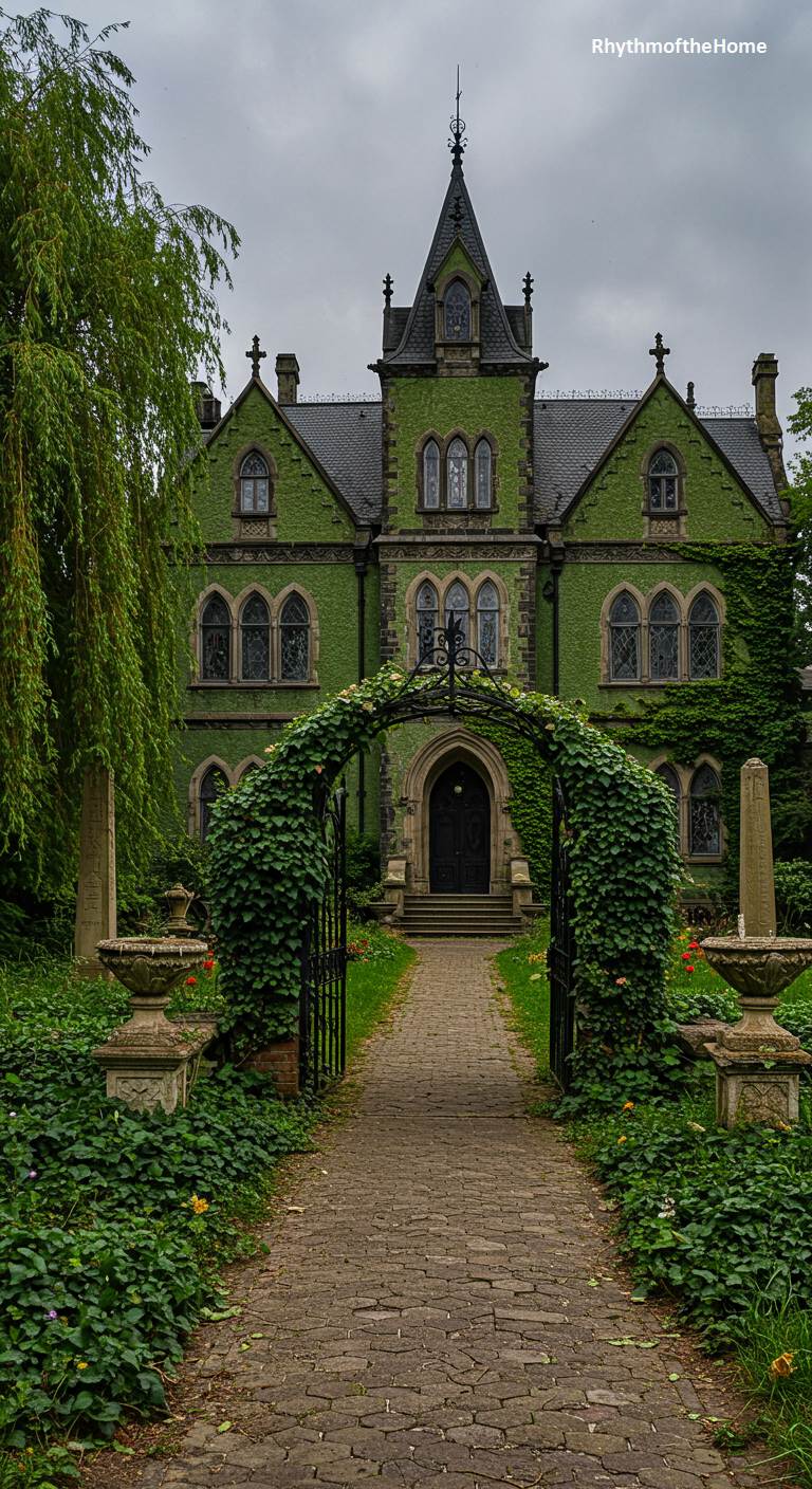 This mysterious Gothic Victorian home is slowly being reclaimed by nature, its stone facade almost completely hidden beneath a thick blanket of green ivy. The entrance to the property is through a wrought-iron archway that is also draped in vines, creating a portal into a secret, forgotten world. The mood is one of romantic decay and quiet solitude, reminiscent of the “Secret Garden.” This is a house that guards its secrets well, its beauty enhanced by its overgrown, untamed surroundings.