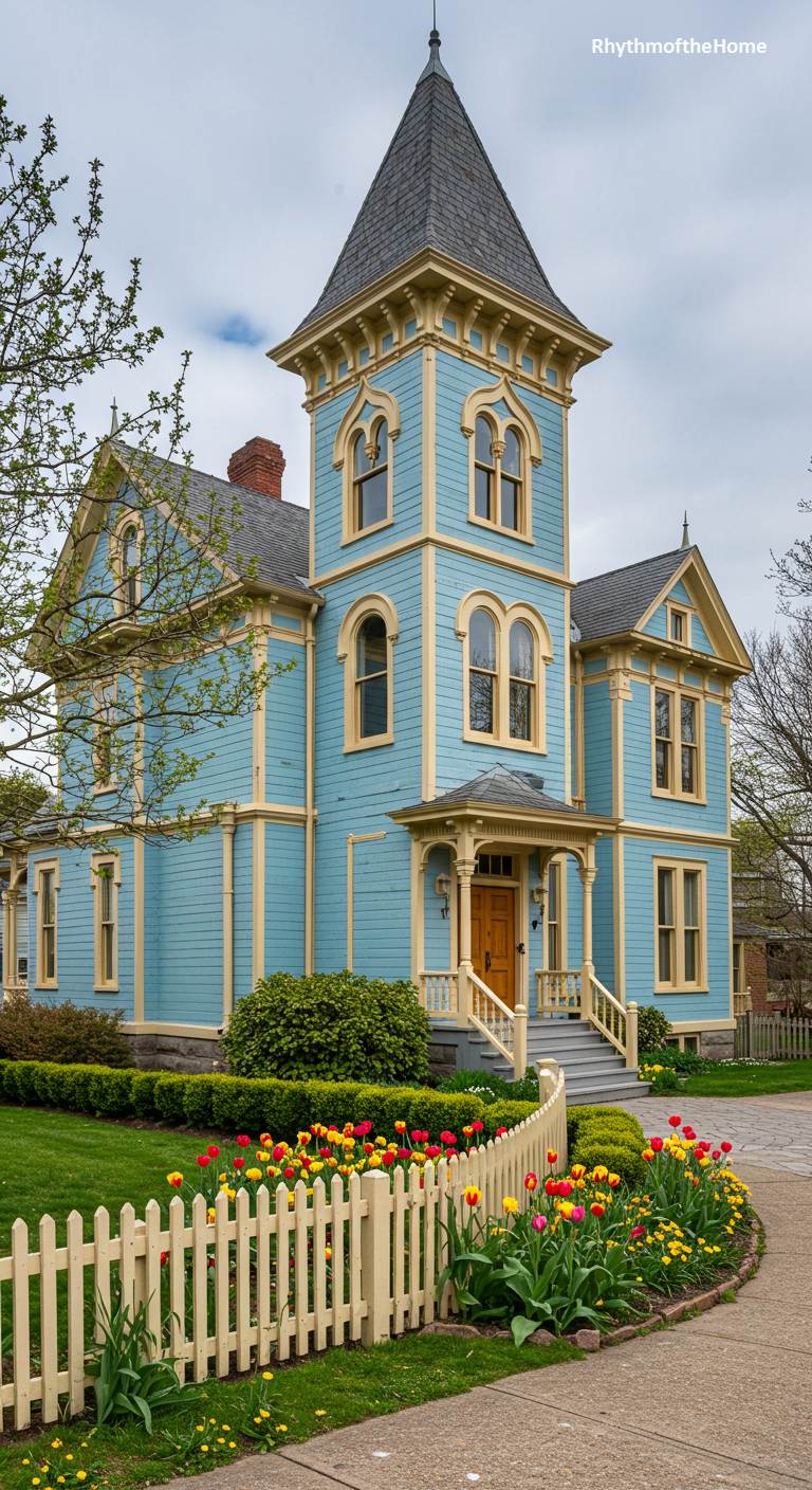 This Italianate Victorian home is a picture of springtime cheerfulness. The facade is painted a bright and welcoming sky blue, with all the trim and ornate window hoods highlighted in a sunny, buttery yellow. A prominent square tower, characteristic of the style, gives the house a stately presence. In the foreground, a low, cream-colored picket fence encloses a curving bed of vibrant red and yellow tulips, creating a perfectly coordinated and joyful scene that is guaranteed to make you smile.