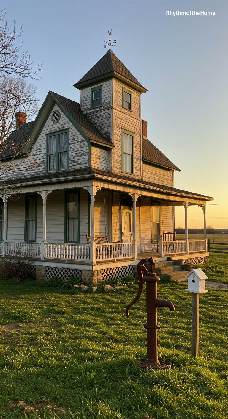 Bathed in the golden light of late afternoon, this old Victorian farmhouse tells a story of rustic endurance. Its white paint is weathered and peeling, revealing the aged wood beneath, while a prominent tower stands as a testament to its former aspirations. A wraparound porch, complete with a gentle swing, looks out over open fields, suggesting a life of simple pleasures and quiet contemplation. In the foreground, a rusty old water pump and a simple birdhouse add to the authentic, nostalgic charm. This home possesses a poignant beauty, a monument to a bygone era of rural American life.