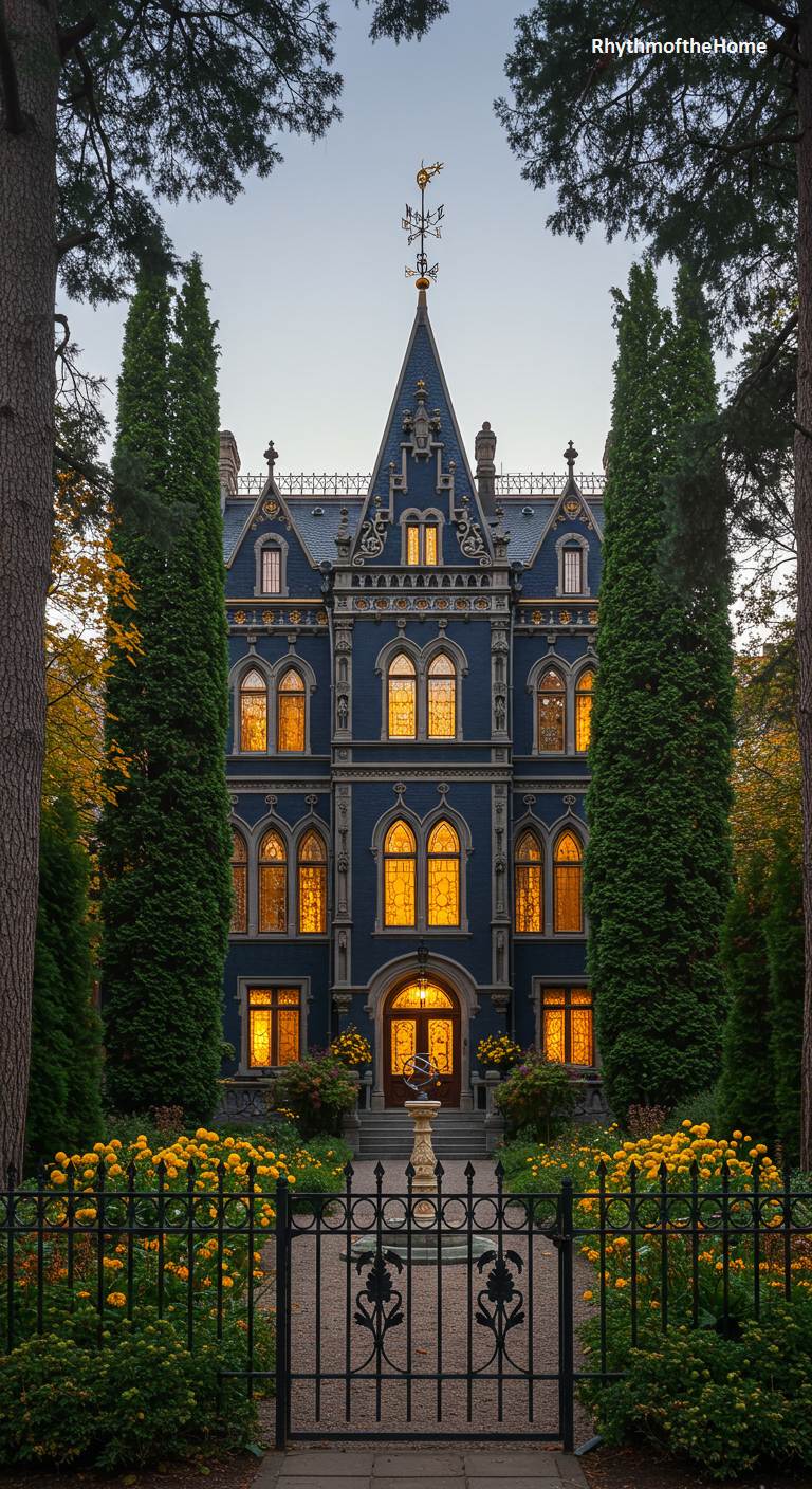 This dark and elegant Gothic Victorian home is a study in powerful symmetry. Its deep blue facade, almost black in the evening light, is perfectly framed between two tall, slender cypress trees that act as natural columns. Every window is aglow with warm, golden light, creating a beautiful and slightly mysterious effect. A small fountain in the foreground reflects the illuminated house, enhancing the balanced and formal composition. It’s a home that is both grand and intimate, exuding an air of sophisticated, old-world mystery.