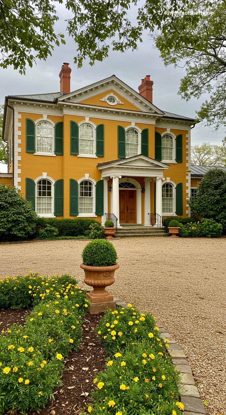 This stately home is a beautiful example of the Federal style, known for its balance, symmetry, and classical details. The facade is painted a bold, cheerful yellow, which is strikingly contrasted by dark green shutters on the numerous large windows. The centerpiece of the design is the elegant entrance, a classical portico supported by two white columns. A simple gravel driveway and well-tended shrubs complete the picture of classic, all-American graciousness and timeless architectural style.