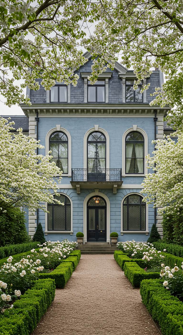 This exquisite home evokes the romantic elegance of a French manor. Its sophisticated pale blue facade is graced with tall, arched windows and a classic mansard roof. A delicate wrought-iron balcony above the entrance adds a touch of Parisian charm. The formal landscaping enhances the romantic feel, with a straight gravel path bordered by low boxwood hedges and beds of pure white roses. Framed by trees bursting with white blossoms, the entire scene is a symphony of grace, beauty, and refined European style.