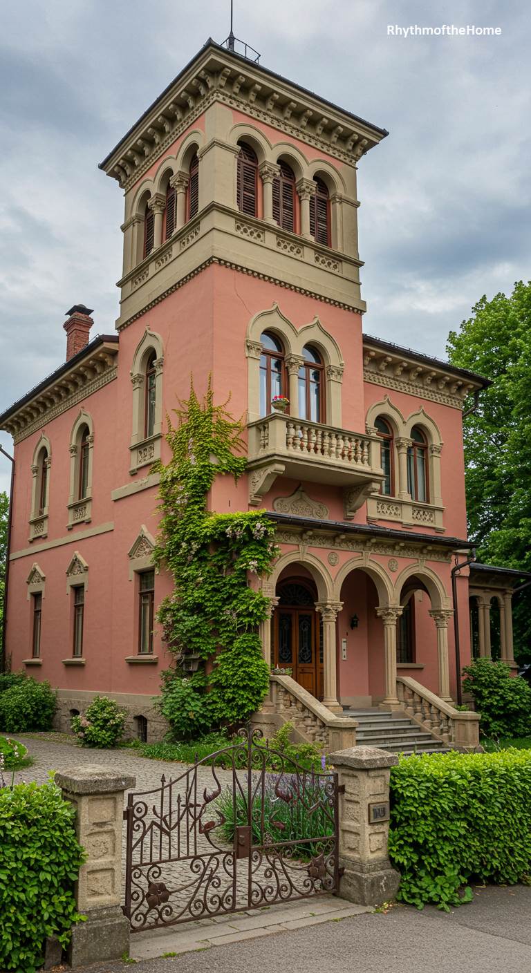 This charming villa captures the warm, romantic spirit of Italy. Its stucco facade is painted a lovely salmon-pink, a color that seems to glow in the soft light. The design is classic Italianate, with a prominent tower, arched windows, and a welcoming arched porch. Climbing vines creep up the walls, and a beautiful wrought-iron gate stands at the entrance, adding to the old-world charm. This is a home that feels sun-kissed and full of life, a perfect blend of stately architecture and relaxed Mediterranean style.