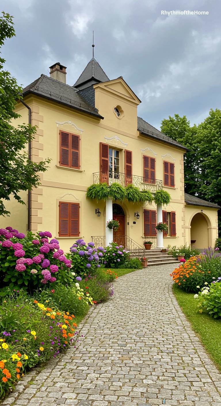 This buttery yellow villa is a vibrant oasis, surrounded by a breathtakingly colorful garden. The home itself is lovely, with a classic European feel and contrasting brown wooden shutters. However, the garden is the true star, a lush and lively paradise overflowing with flowers. Enormous hydrangea bushes in shades of deep pink, purple, and blue create a stunning display, complemented by a profusion of other bright blooms. A cobblestone path winds through this floral wonderland, leading to a home that is bursting with life and joy.