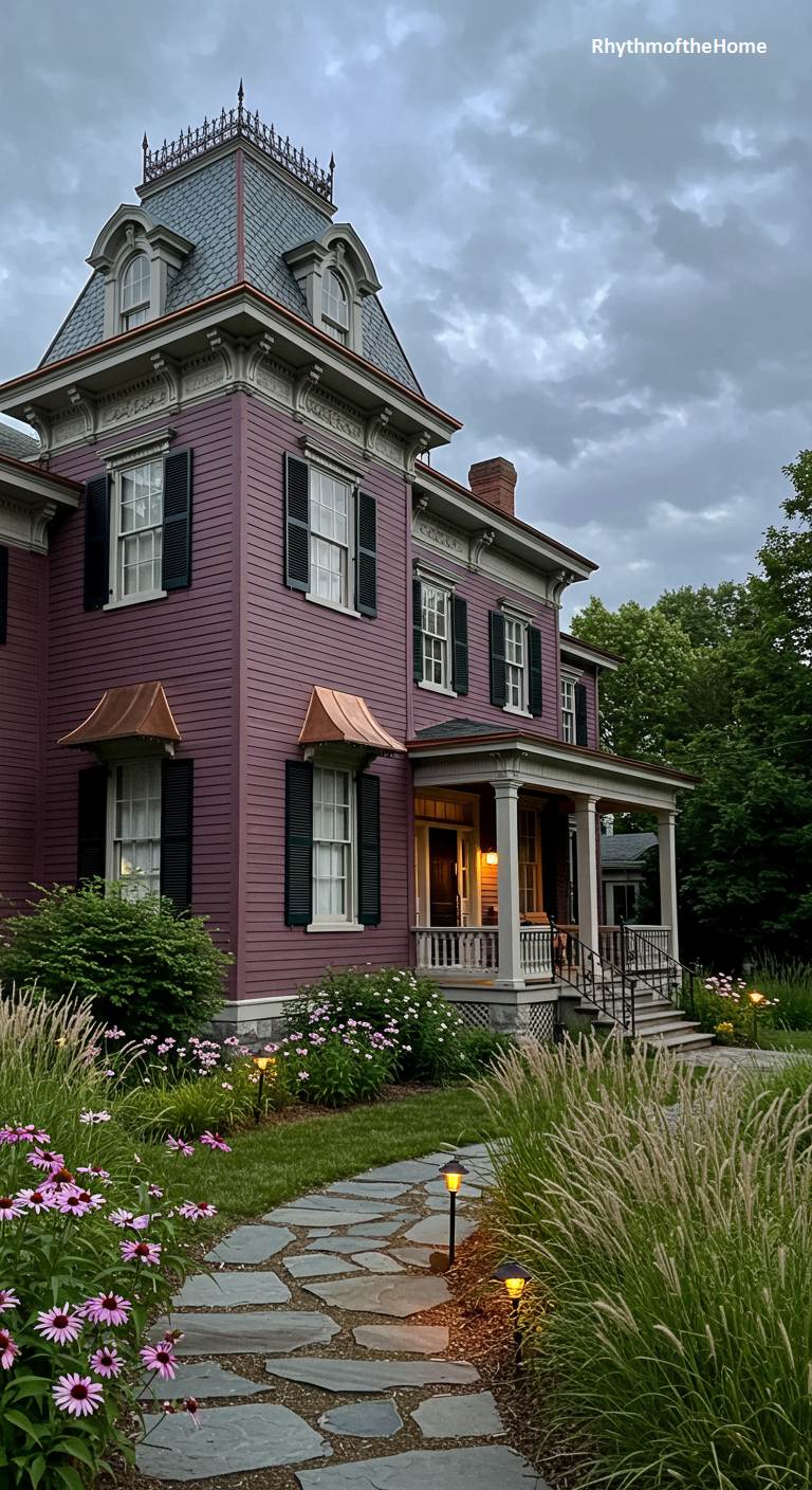 This handsome Second Empire Victorian home showcases a sophisticated and unique color palette. The main body is painted a rich mauve, beautifully accented by a classic gray mansard roof and dark green shutters. The small copper awnings over the first-floor windows are a distinctive and elegant touch. As dusk settles, subtle landscape lighting illuminates a flagstone path and beds of ornamental grasses, casting a soft, warm glow and creating an atmosphere of quiet, understated luxury and inviting charm.