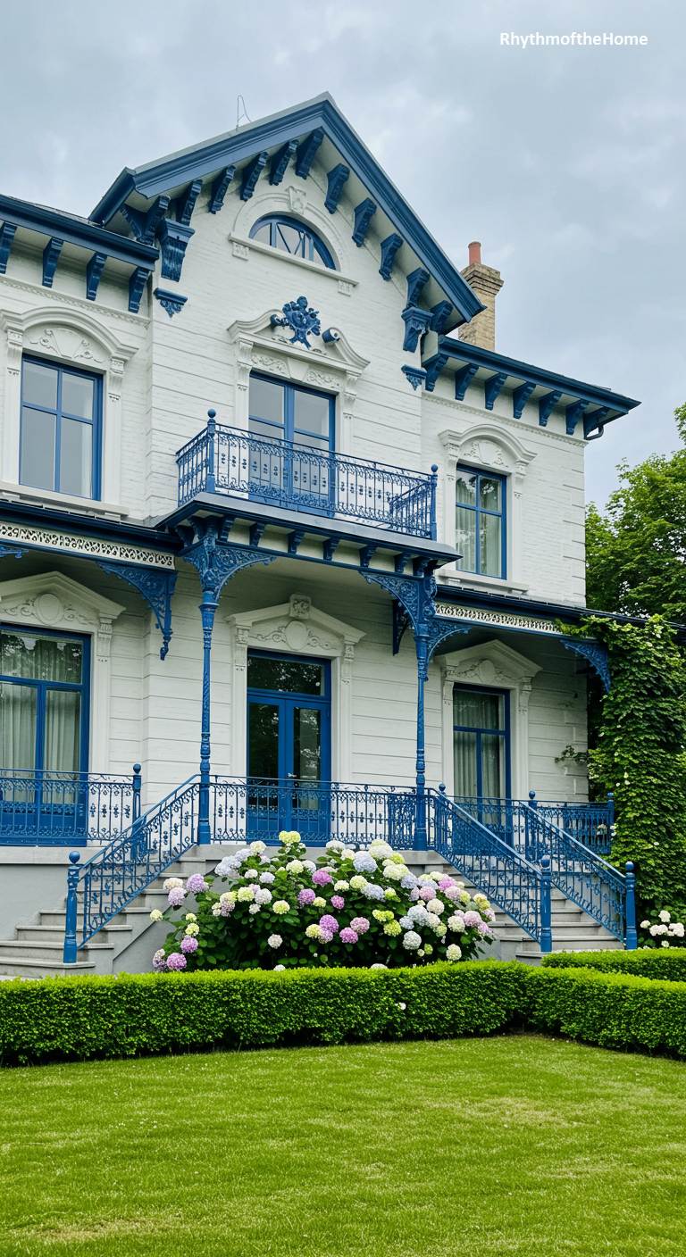 This Victorian home makes a crisp and striking statement with its bold color combination. The entire structure is painted a brilliant white, which serves as a perfect canvas for the stunning royal blue accents. All of the ornate, decorative elements—from the intricate cast-iron porch supports and railings to the window frames—are painted in this vibrant blue, giving the historic architecture a fresh, sharp, and almost nautical feel. A large hydrangea bush at the base of the grand staircase adds a touch of natural softness to the graphic design.