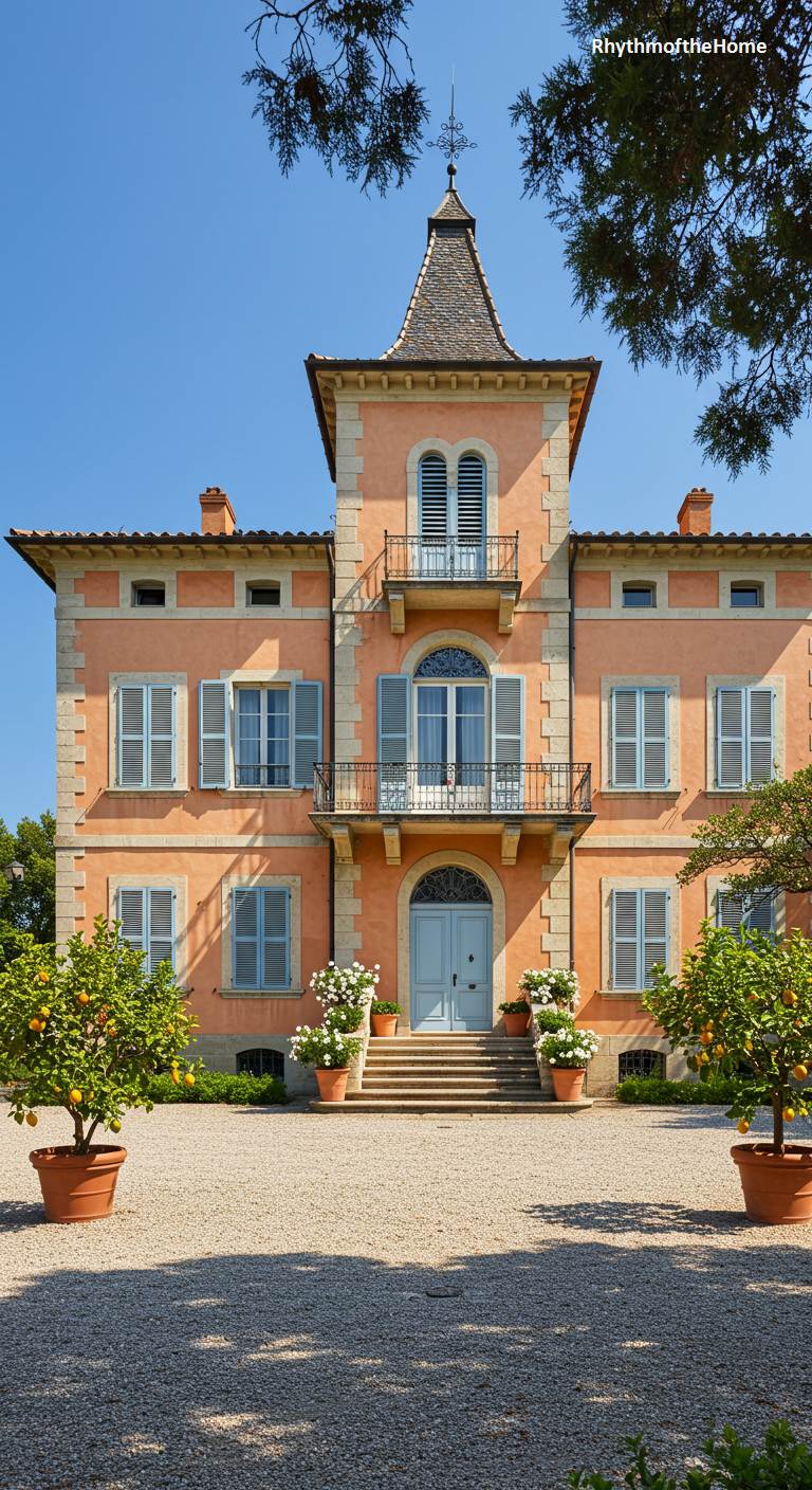 This delightful Italianate villa feels like it has been plucked from the sun-drenched coast of the Mediterranean. Its stucco facade is a warm and welcoming peach color, which is perfectly complemented by soft, sky-blue shutters and a matching front door. The architecture features a prominent tower and elegant balconies. The entrance is flanked by two large terracotta pots containing lemon trees, completing the authentic, sunny Italian atmosphere of this charming and beautifully designed home.