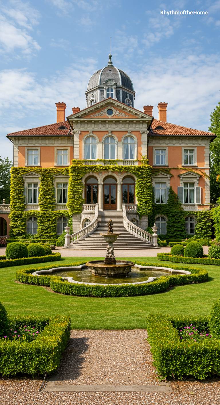 This breathtaking villa is a masterpiece of Italianate and Beaux-Arts architecture, exuding an air of palatial grandeur. The warm-toned stucco facade is adorned with elegant arched windows and climbing ivy, leading up to a magnificent domed mansard roof. A sweeping double staircase creates a dramatic entrance to the main level. The meticulously manicured grounds feature formal boxwood hedges, a classic tiered fountain, and a gravel path, all contributing to the property’s opulent, estate-like feel. This is a home designed to impress, a symbol of immense wealth and sophisticated taste.