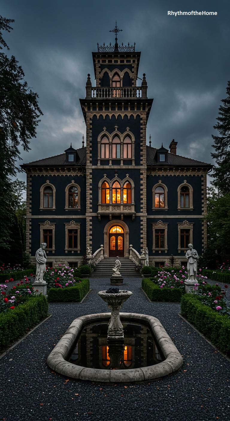 This stately Italianate Victorian home is steeped in a dark, moody, and mysterious atmosphere. Its dark-colored facade and imposing central tower loom in the twilight, creating a gothic and formidable presence. A single, warmly lit window draws the eye, hinting at the life within. The formal garden, with its reflecting pool, classical statues, and rows of roses, adds to the sense of drama and old-world wealth. This is a home that feels like the setting of a great mystery novel, full of secrets and dramatic beauty.