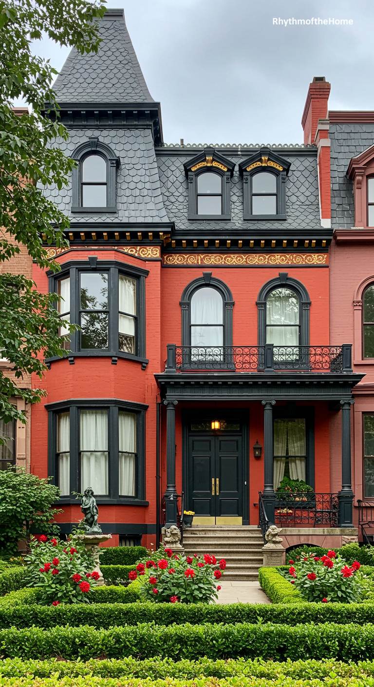 This Victorian rowhouse is a stunning example of opulent urban design. Its classic red brick facade is made dramatically sophisticated with the addition of bold black trim on the windows, doors, and porch columns. The most striking feature is the ornate, gilded frieze that runs along the roofline, adding a touch of luxurious, Gilded Age glamour. A formal front garden with neat box hedges and vibrant red roses, enclosed by a black iron fence, completes this picture of rich, confident, and highly stylized city living.