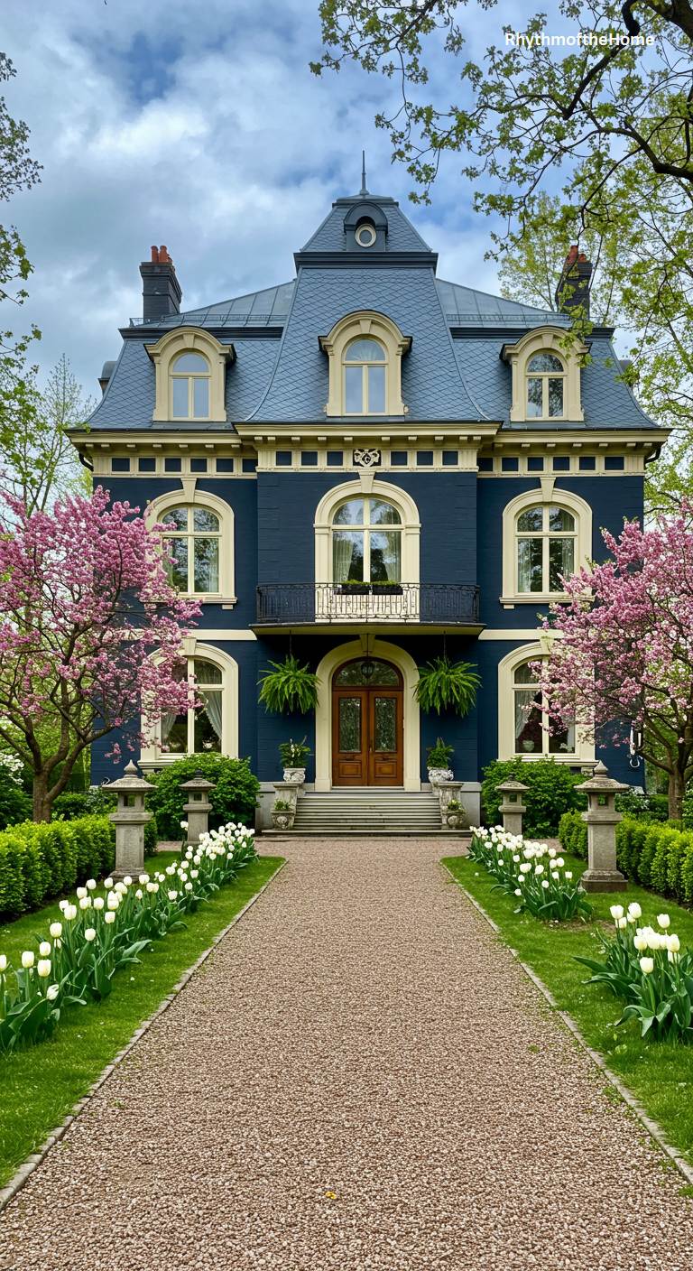 This magnificent French-inspired Victorian home is a vision of springtime splendor. Its deep navy blue facade provides a dramatic backdrop for the perfectly symmetrical landscaping. A straight gravel path leads to the central entrance, flanked on either side by rows of pristine white tulips and two stunning cherry trees in full, vibrant pink bloom. The combination of the bold, dark house color and the bright, fresh colors of the spring flowers creates a breathtaking scene of formal beauty and natural exuberance.