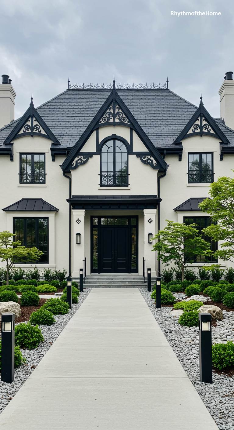 This residence is a chic, contemporary take on classic French chateau architecture. It adopts the traditional symmetrical form, steep hip roof, and prominent gables, but translates them into a modern, minimalist language. The exterior is a clean, off-white stucco, sharply contrasted with bold black trim, windows, and roof accents. The landscaping is equally modern and geometric, with a straight concrete path, carefully placed rocks, and manicured shrubs. This home is a sophisticated blend of old-world inspiration and new-world style.