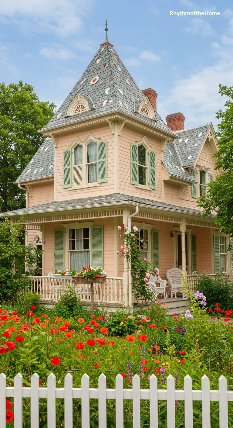 This whimsical Victorian home is the picture of cottage charm. Its facade is a soft pastel pink, with sage green shutters adding a gentle contrast. The decorative slate roof, with its patterned tiles, is a particularly lovely feature. A classic white picket fence encloses a vibrant and informal cottage garden, absolutely overflowing with a cheerful sea of red poppies and other colorful flowers. This is a sweet, romantic, and utterly delightful home that seems to have sprung from the pages of a children’s storybook.
