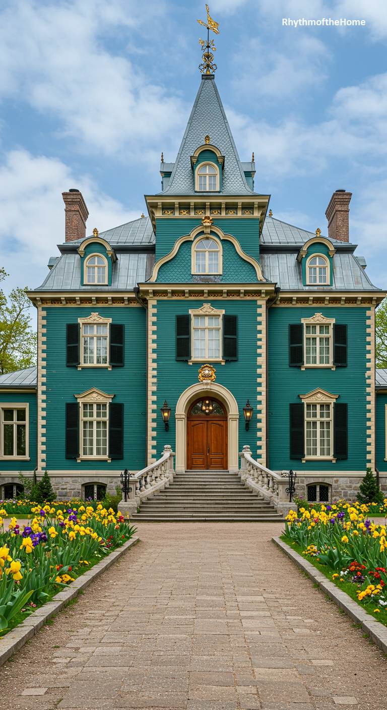 This magnificent Second Empire Victorian home is a jewel box of rich color and ornate detail. The facade is painted a deep, luxurious teal, with cream and gold accents highlighting its architectural features. The classic mansard roof is topped with elaborate iron cresting and a prominent weathervane. A grand stone staircase leads to the front entrance, and the long pathway is lined with a beautiful spring display of yellow and purple irises. This is a truly regal residence, exuding an air of wealth and sophisticated taste.