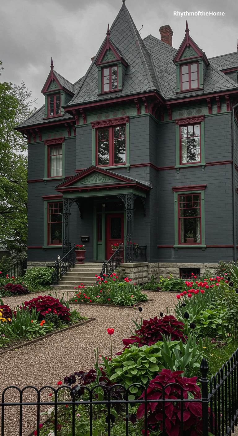 This Victorian home showcases a sophisticated and unconventional color palette. The main body is a dark, moody slate gray, which serves as a dramatic canvas for the deep red window frames and dark green porch and trim. This rich and unique combination of colors gives the house a distinguished and memorable character. The garden is thoughtfully planted with flowers and foliage in shades of red and burgundy, perfectly complementing the home’s distinctive style and creating a cohesive and elegant overall look.