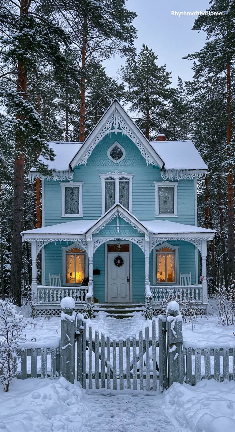This Carpenter Gothic Victorian home looks like a scene from a Christmas card, nestled in a serene, snow-covered forest. Its lovely sky-blue siding is adorned with intricate, white “gingerbread” trim along the porch and gables, resembling delicate lacework against the winter landscape. Warm, inviting light glows from the windows, promising a cozy refuge from the cold. A quaint wooden picket fence, dusted with snow, encloses the front yard, completing this picture of idyllic and peaceful winter charm. It’s a whimsical fairytale cottage come to life.
