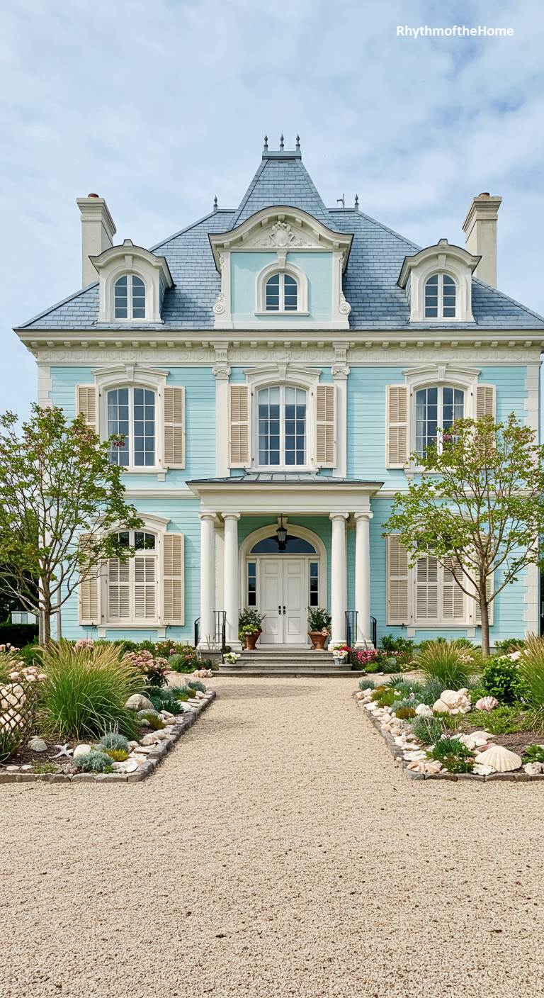 This beautiful home perfectly captures the essence of a breezy French coastal villa. Its facade is painted a lovely, soft sky blue, with a classic mansard-style roof adding to its European charm. An elegant portico with stately white columns frames the entrance. The landscaping enhances the seaside theme, with a gravel path, mounds of ornamental grasses, and large, beautiful seashells artfully placed as decoration. This home is a sophisticated and serene retreat that evokes the timeless style of the French Riviera.
