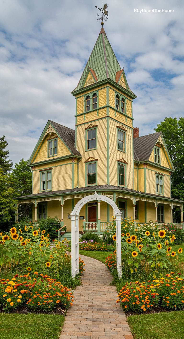 93. Sunny Yellow Victorian Home with Sunflower Garden